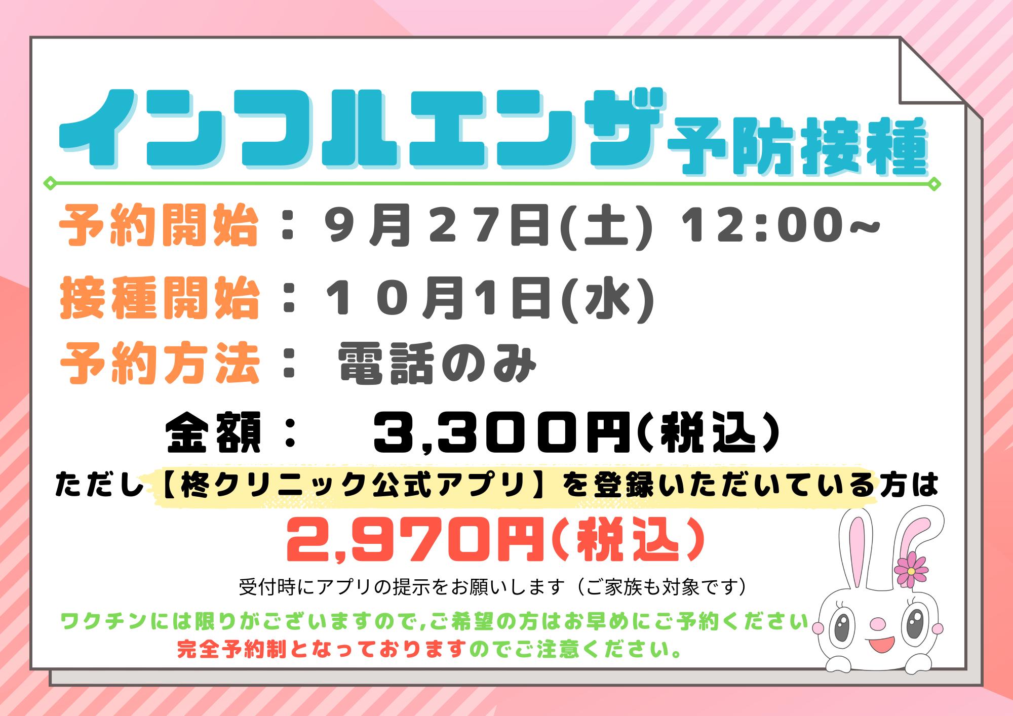 金曜日耳鼻咽喉科医師の体調不良により臨時休診中。インフルワクチン接種は診療再開次第開始いたします。